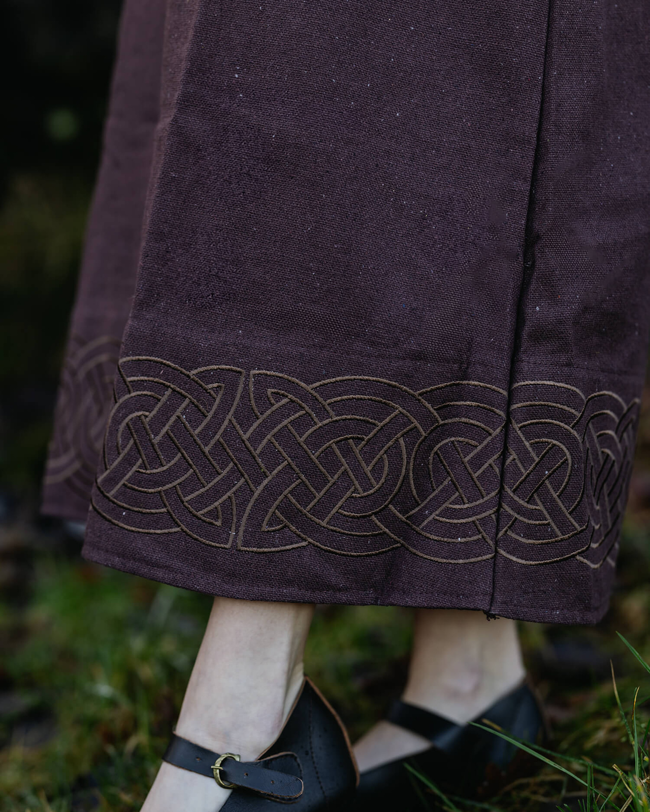 Fartuch “Alva” to coś idealnego dla miłośnika wikińskiego stylu. Krój wzorowany jest na historycznym, powoli rozszerza się ku dołowi na kształt litery A i sięga aż do łydki. Zarówno górny, jak i dolny brzeg fartucha ozdobione są haftem, nadając mu atrakcyjny dla oka wygląd. Fartuch wykonany jest z płótna bawełnianego o grubym splocie. Najlepiej prezentuje się w połączeniu z suknią spodnią (giezłem).