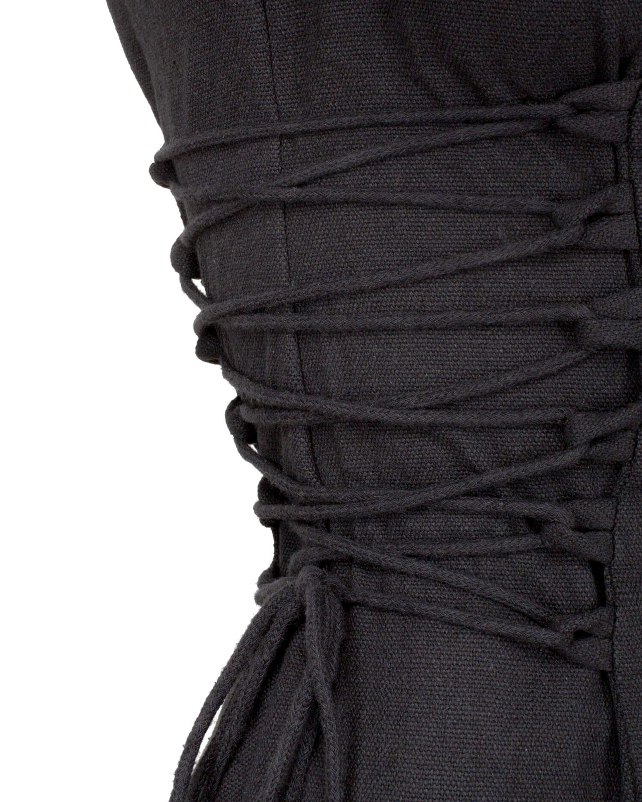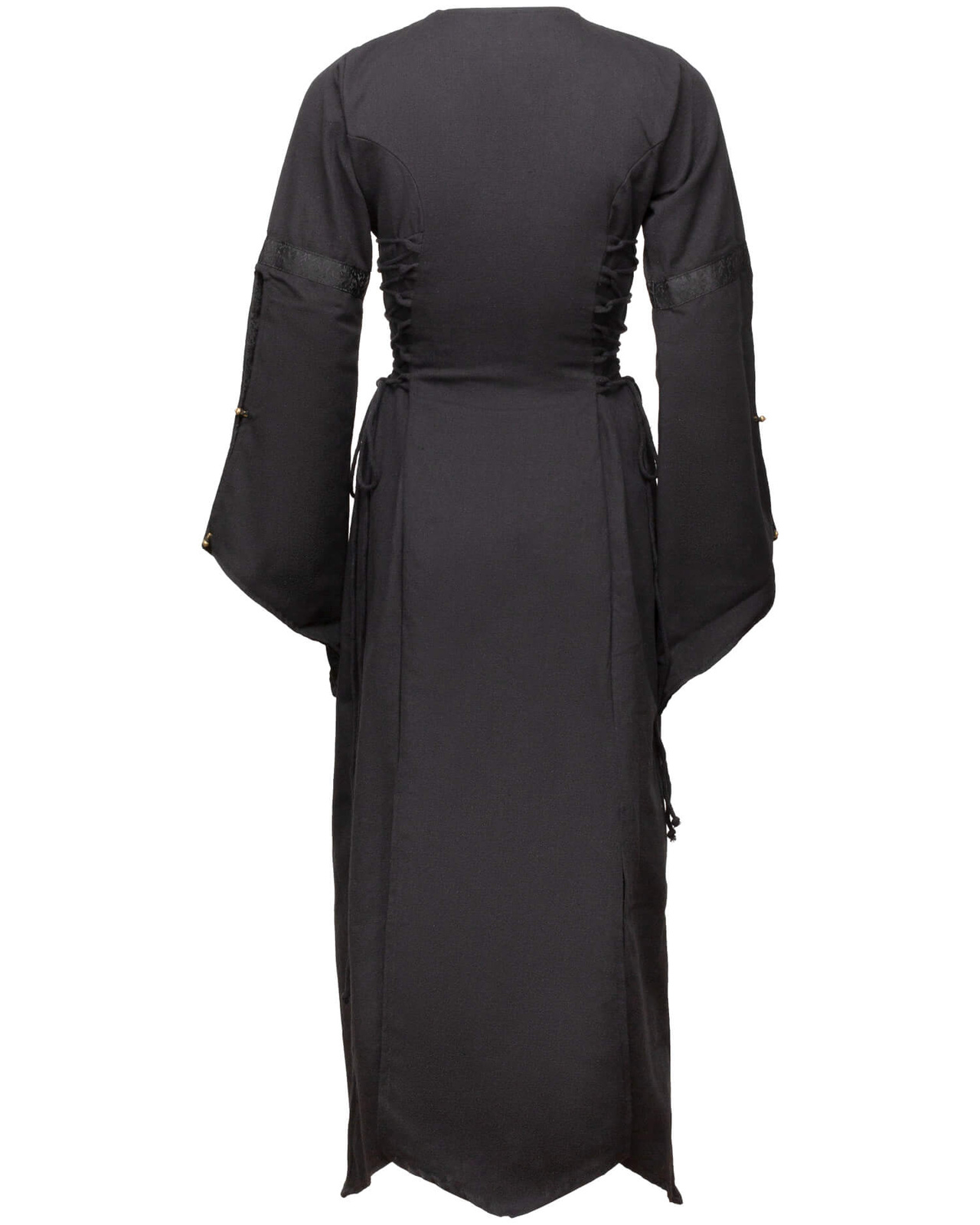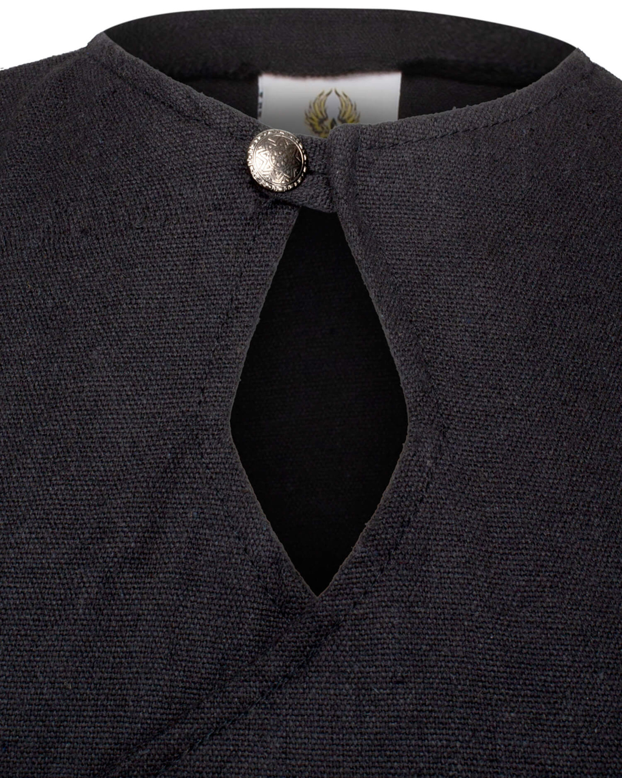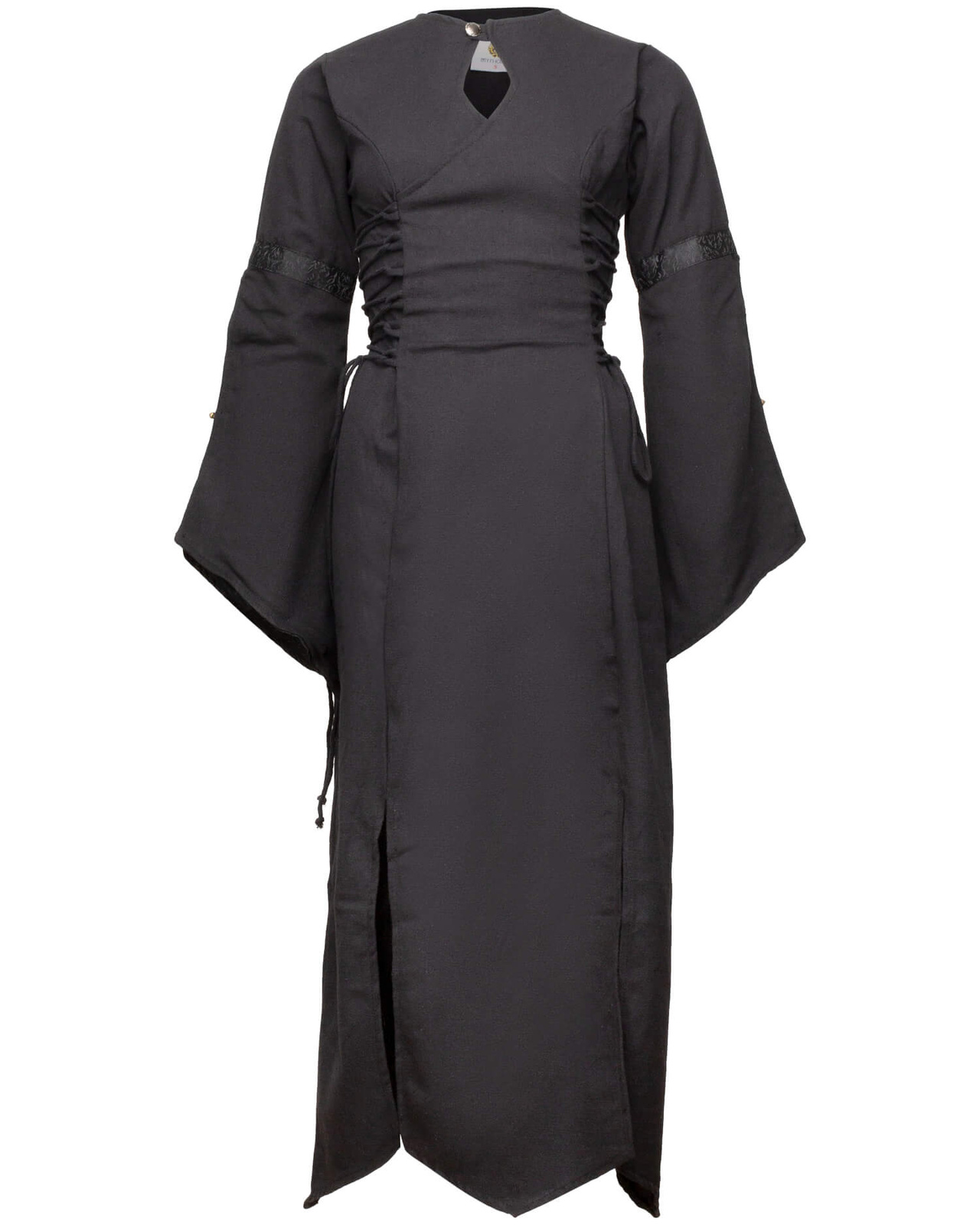 Antaris Dress to strój, który sprawdzi się w niemal każdej sytuacji – od swobodnych dni w obozie po wystawne uczty i uroczystości. Suknia wykonana jest z mocnego płótna bawełnianego, a jej prosty krój wzbogacono detalami, które nadają całości wyrafinowanego charakteru. Dekolt zapinany na ozdobny guzik podkreśla elegancję, a szerokie rękawy zakończone zapięciami zapewniają nie tylko komfort, ale też smukłą i dostojną sylwetkę.