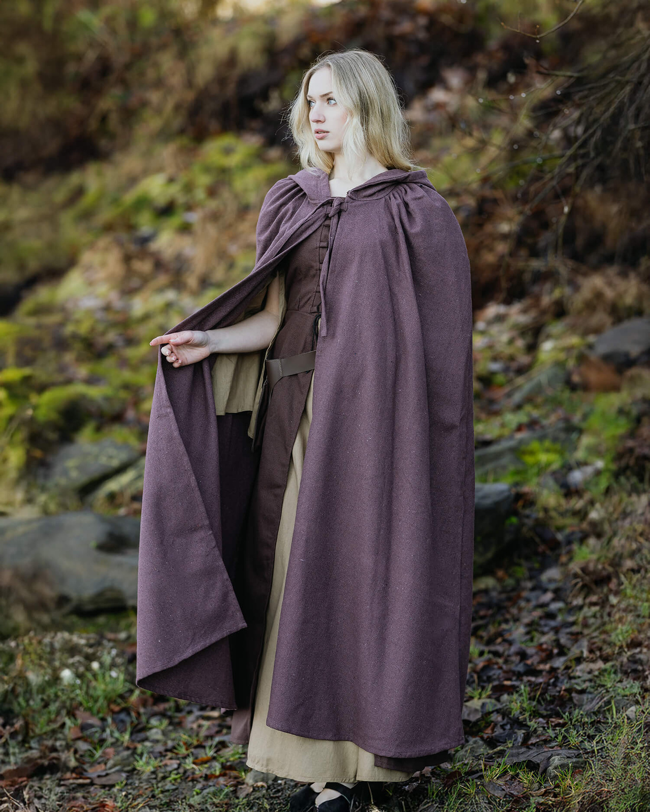Kaptur zapewnia dodatkową osłonę i wprowadza charakterystyczny, przygodowy akcent. Peleryna zapinana jest z przodu na mocno przyszyte troki z tkaniny, co gwarantuje stabilne dopasowanie i prostotę użytkowania.