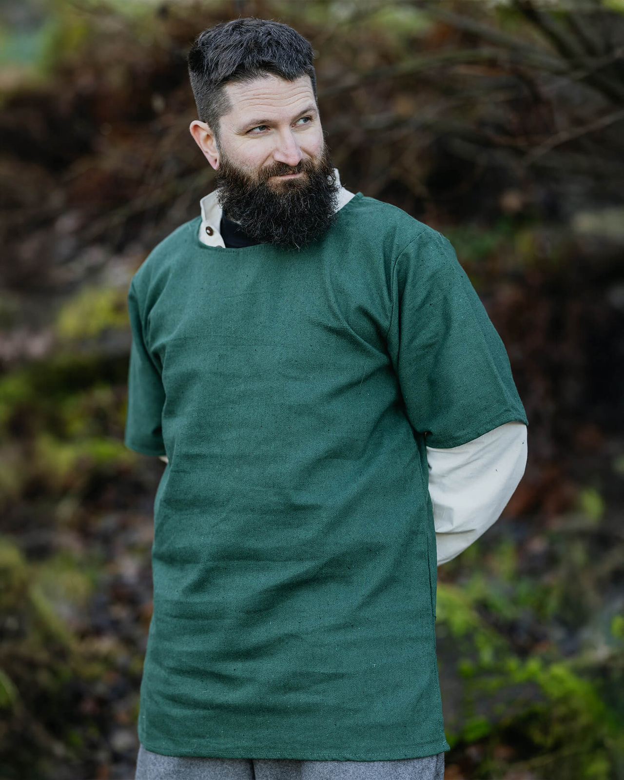 Tunika „Godwin” to doskonała baza do wielu różnych kreacji. Prosty, klasyczny krój z krótkimi rękawami sprawia, że pasuje do wielu postaci – od wieśniaków, podróżników i rzemieślników, po wojowników. Płótno bawełniane jest wyjątkowo trwałe i odporne na zużycie, dzięki czemu tunika świetnie sprawdzi się zarówno podczas długich dni na LARP-ie, jak i na jarmarkach średniowiecznych. Noszona samodzielnie lub w połączeniu ze spodniami, pasem i dodatkami, stanowi solidną i autentyczną podstawę kostiumu.