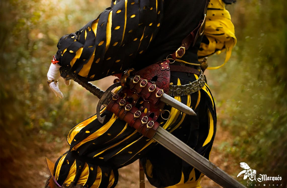 Stylowy, funkcjonalny i pełen charakteru – ten pas mieczowy został zaprojektowany z myślą o szermierzach, którzy chcą mieć broń zawsze pod ręką. Idealny dla tych, którzy kroczą ścieżką chwały, pragną bohaterskiej śmierci lub po prostu chcą zaprezentować swoje ostrze z należną dumą. Dzięki solidnemu wykonaniu i możliwości zamocowania dwóch broni, torby lub dodatkowych pochw na miecze, sprawdzi się w każdej sytuacji – od pojedynków po zasadzki w miejskich zaułkach.