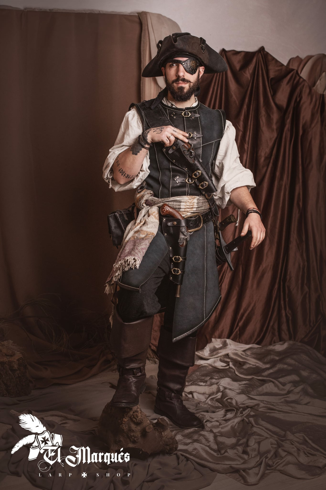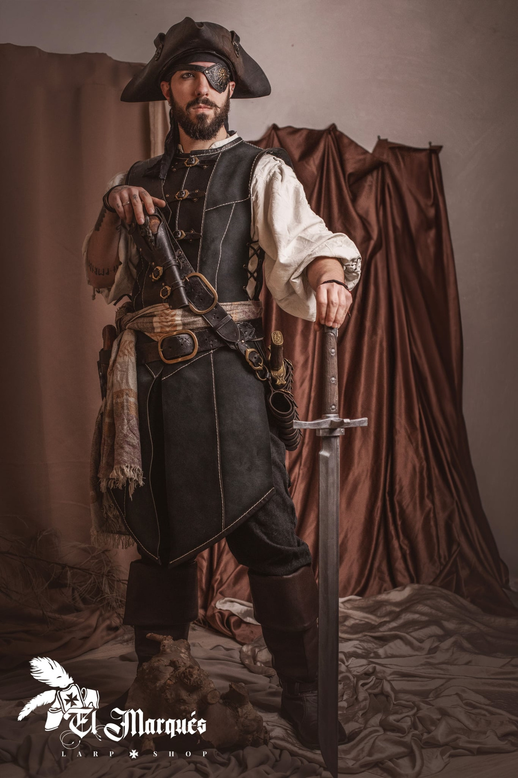 Długi krój z rozcięciami nadaje całości dostojny, a zarazem bojowy charakter. Zapięcie na sprzączki z przodu oraz boczne dopasowanie za pomocą bawełnianego sznurka pozwalają idealnie dostosować dublet do sylwetki – po jednorazowym wyregulowaniu wystarczy zapinać go z przodu. Wygodny w noszeniu, łatwy do zakładania i zdejmowania, świetnie sprawdzi się zarówno dla oficerów, szlachty, jak i dobrze ubranych najemników.
