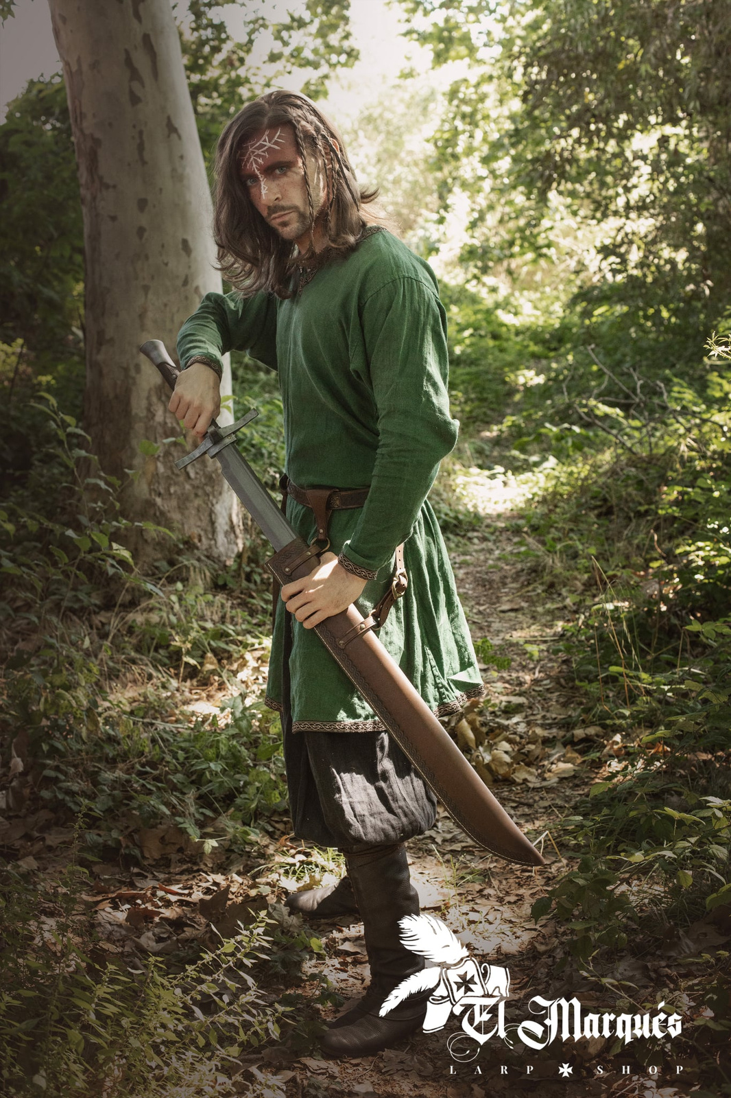 Pochwa wykonana jest z grubej, ok. 2,5 mm skóry, co gwarantuje trwałość i odpowiednią sztywność. Klasyczne wykończenie oraz dopasowany kształt sprawiają, że całość świetnie komponuje się z charakterystyczną sylwetką noża typu Messer. Dzięki mocnej konstrukcji idealnie nadaje się do użytku zarówno podczas rekonstrukcji historycznych, jak i w LARP-ach, gdzie liczy się wygląd i niezawodność.