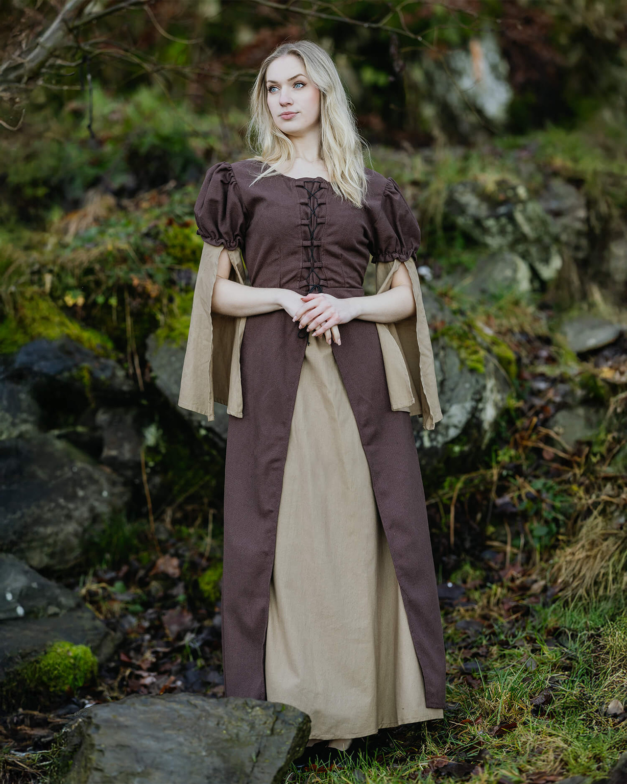 Sukienka „Loreley” to elegancki wybór, szczególnie dla postaci o wysokim statusie społecznym. Dzięki starannym zdobieniom i dopasowanemu krojowi, podkreśla kobiecą sylwetkę, a szew w talii nadaje jej wyraźną formę. Sznurowanie z przodu i regulacja z tyłu pozwalają na perfekcyjne dopasowanie do figury, jednocześnie dodając ozdobnego akcentu. Szerokie ramiona oraz rozcięte, płynnie opadające rękawy nadają sukience wytworny, dworski charakter, co czyni ją idealną dla arystokracji.
