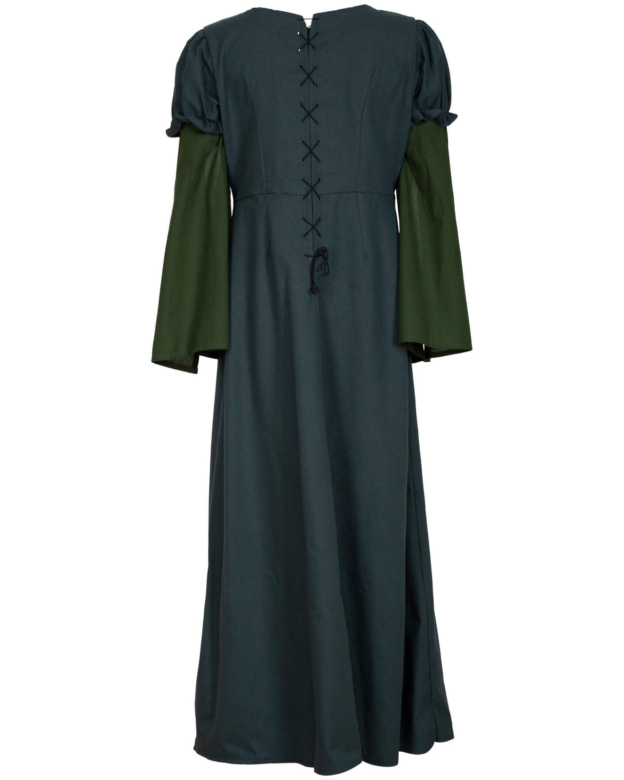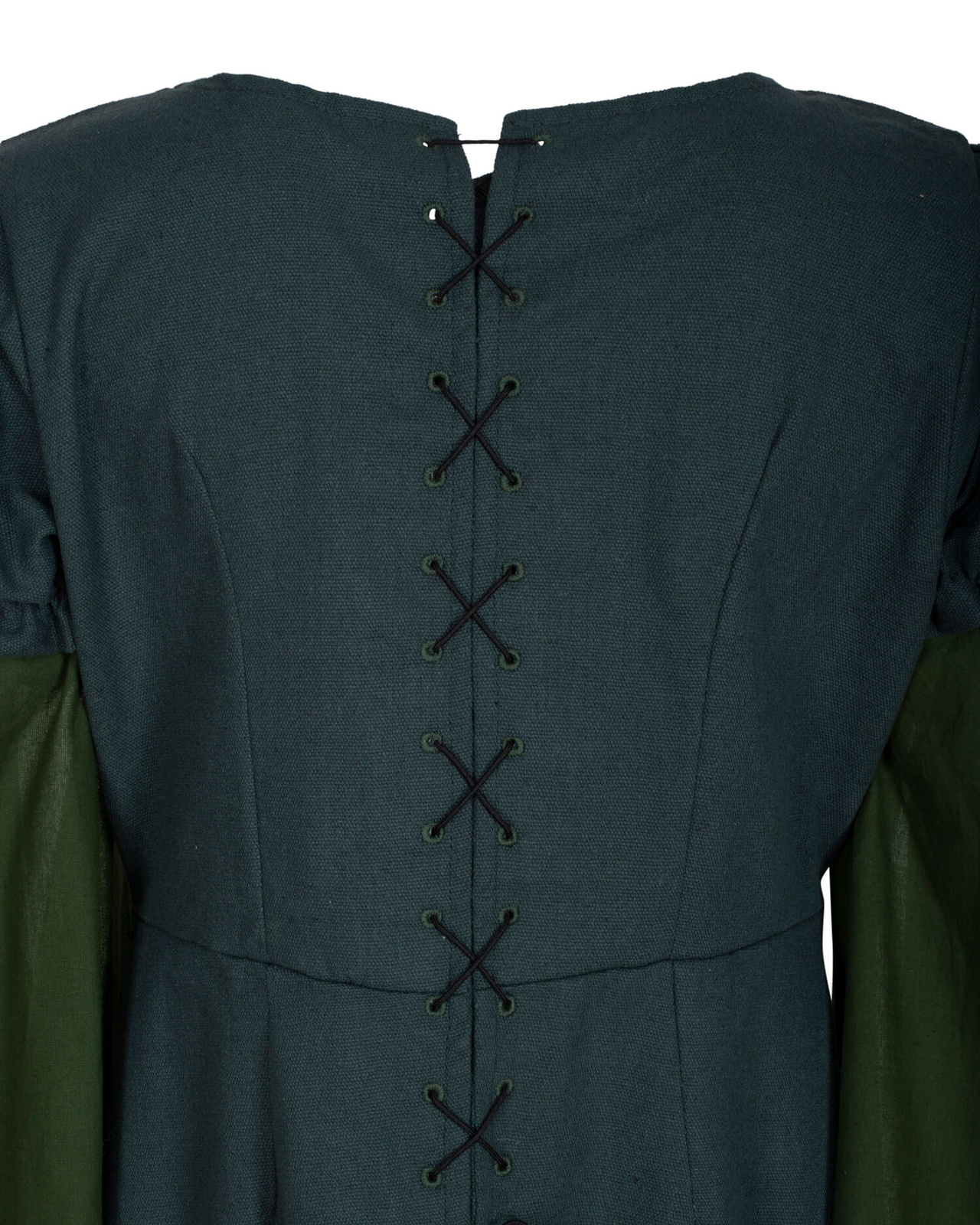 Sukienka „Loreley” to elegancki wybór, szczególnie dla postaci o wysokim statusie społecznym. Dzięki starannym zdobieniom i dopasowanemu krojowi, podkreśla kobiecą sylwetkę, a szew w talii nadaje jej wyraźną formę. Sznurowanie z przodu i regulacja z tyłu pozwalają na perfekcyjne dopasowanie do figury, jednocześnie dodając ozdobnego akcentu. Szerokie ramiona oraz rozcięte, płynnie opadające rękawy nadają sukience wytworny, dworski charakter, co czyni ją idealną dla arystokracji.