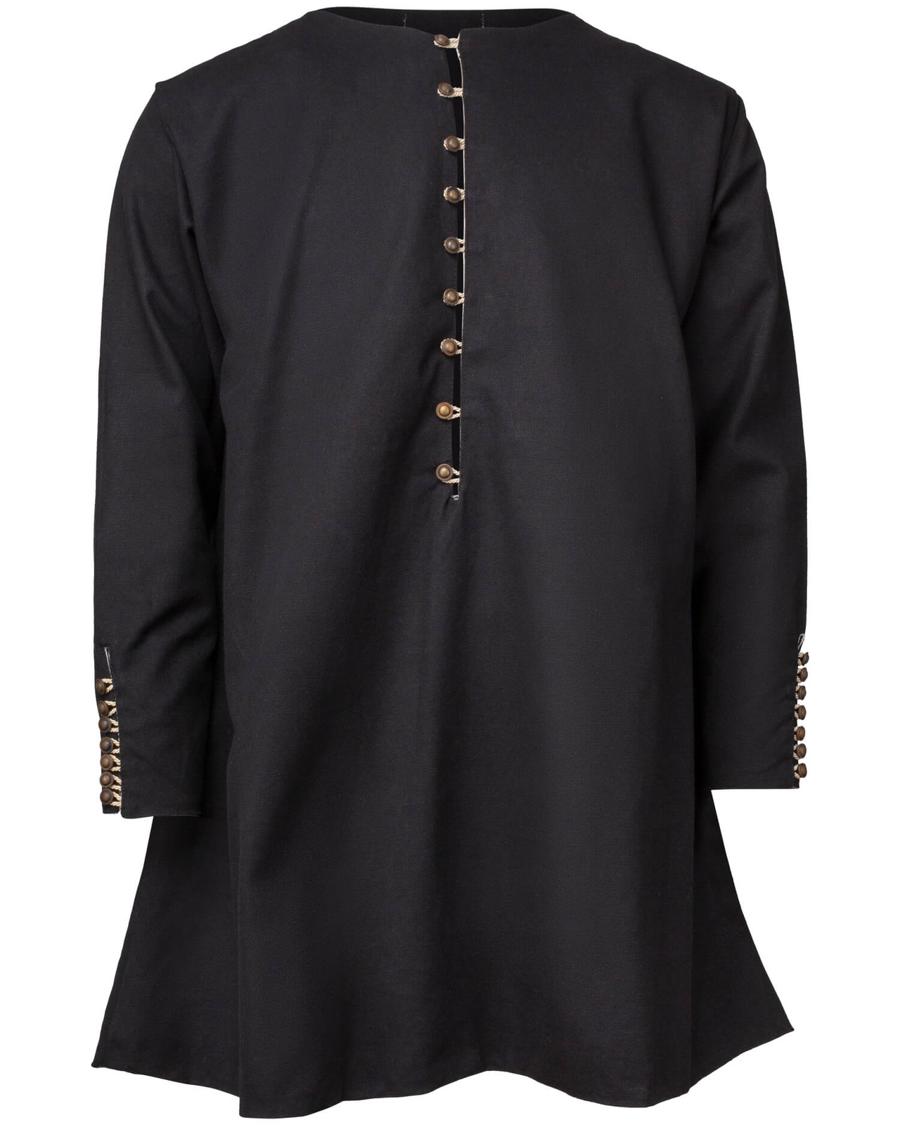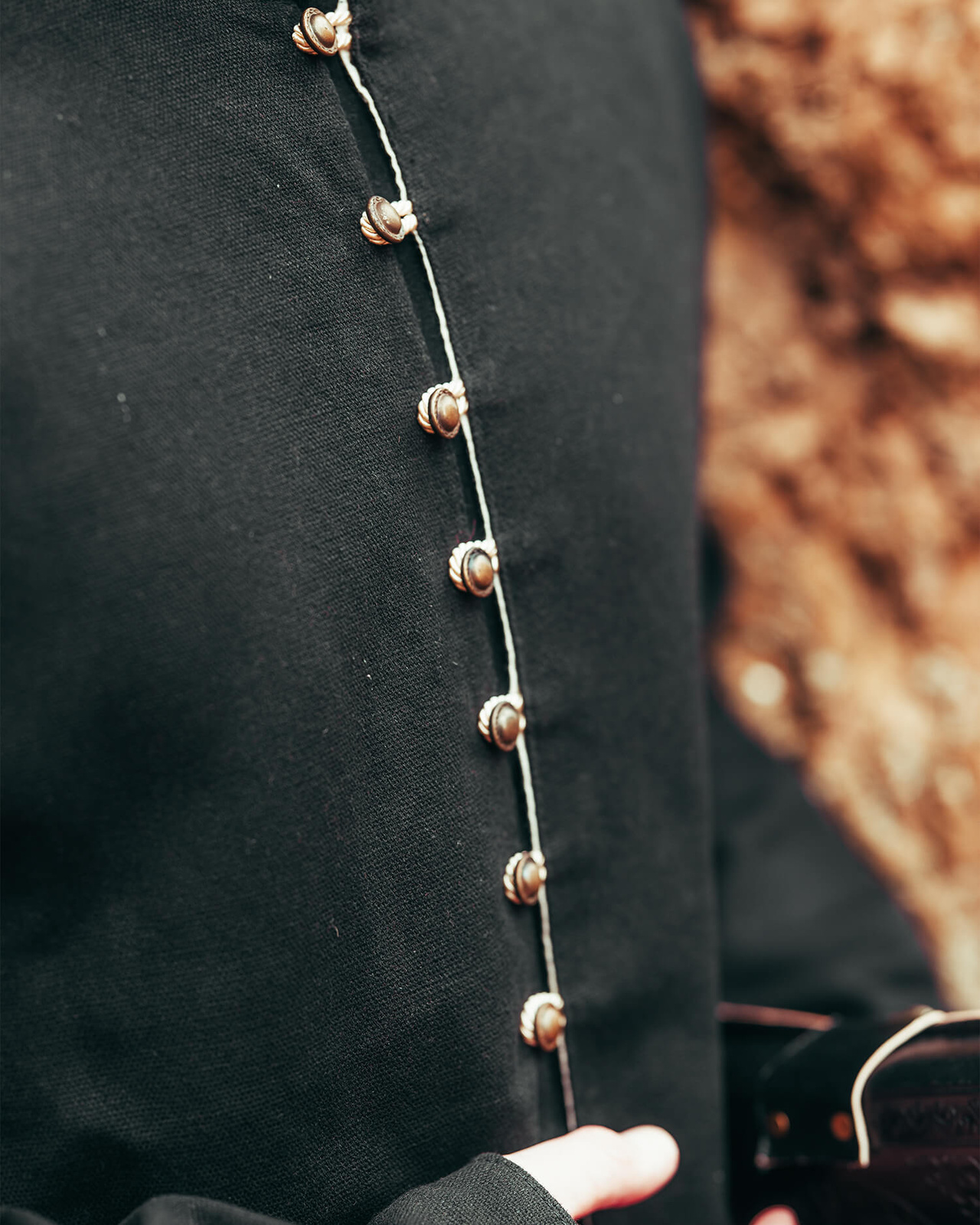 Tunika „Rafael” zachwyca dopracowanym krojem i dbałością o detale. Wykonana z solidnego płótna o gęstym splocie, podszyta od wewnątrz miękką bawełną, łączy w sobie trwałość i komfort noszenia. Eleganckie mosiężne guziki oraz ozdobne pętelki biegnące wzdłuż piersi nadają jej wyjątkowo szlachetny wygląd, który doskonale podkreśla status postaci.