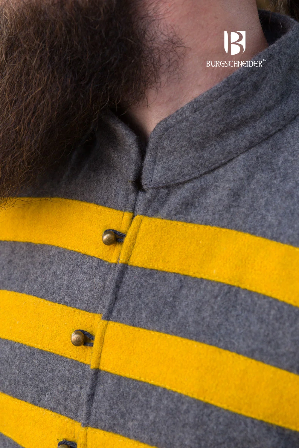Kaftan Bartosz wzorowany na tradycyjnych ubiorach wschodniosłowiańskich, łączący prestiż z funkcjonalnością. Kontrastujące barwy – intensywna żółć przy mankietach, dolnym obszyciu oraz na pasach biegnących przez pierś – wyróżniają się na tle szarego materiału, podkreślając historyczne odniesienia do wyższych stanów społecznych. Charakterystyczne pasy na piersi ozdobione są szeregiem guzików, które pełnią zarówno funkcję dekoracyjną, jak i symboliczną. Stójka zapewnia wygodę oraz dodatkową ochronę przed chłodem, a długość do kolan ułatwia warstwowanie stroju – zarówno jako odzienie wierzchnie, jak i część bardziej złożonej stylizacji.