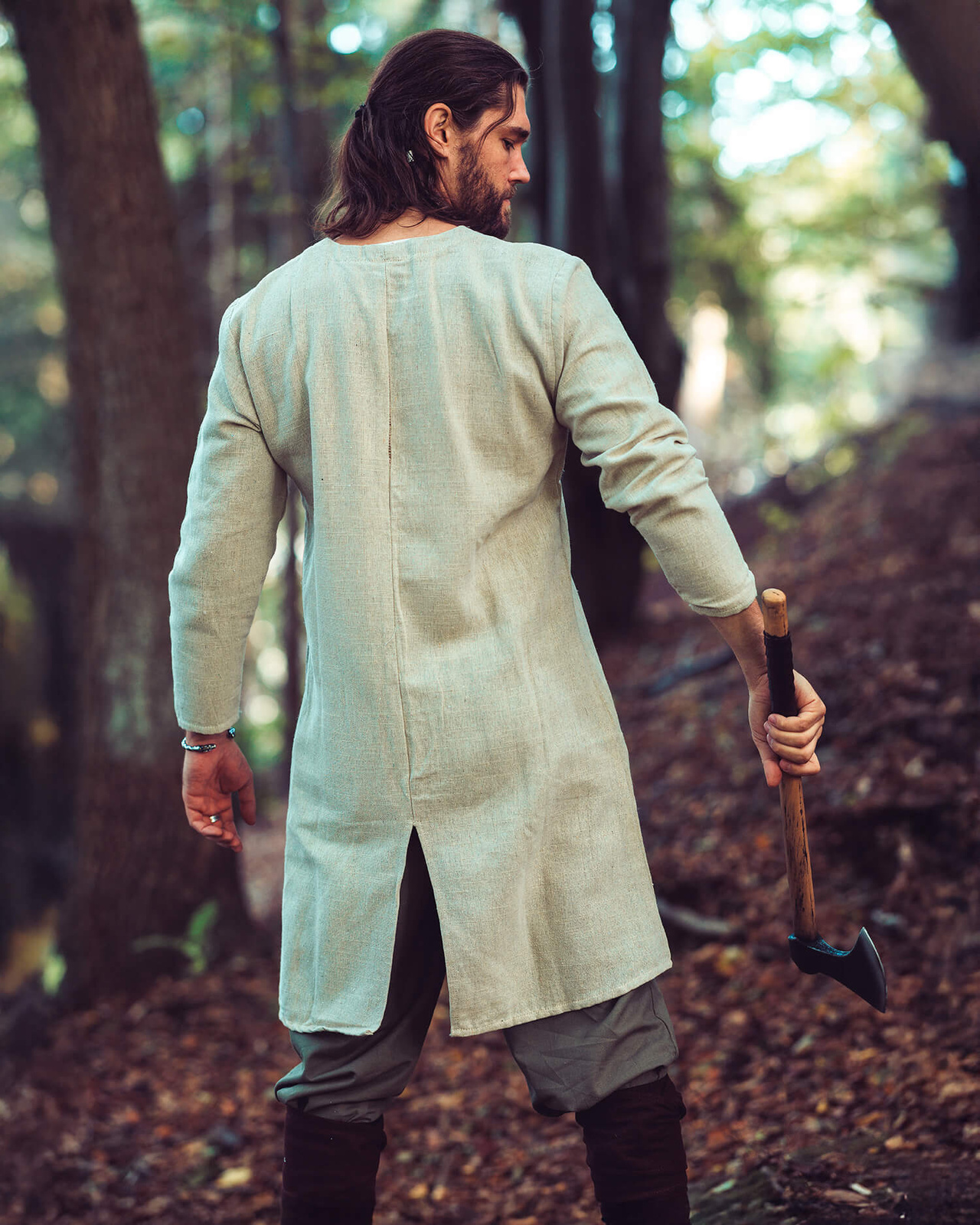 Tunika Sigeric to uniwersalna propozycja dla miłośników prostoty i autentycznego stylu dawnych epok. Jej klasyczny krój z prostokątnym dekoltem nawiązuje do tradycyjnych wzorów nordyckich i wczesnośredniowiecznych ubiorów, dzięki czemu stanowi świetny punkt wyjścia do budowania wielu różnych kostiumów — od skandynawskiego wojownika po prostego rzemieślnika.