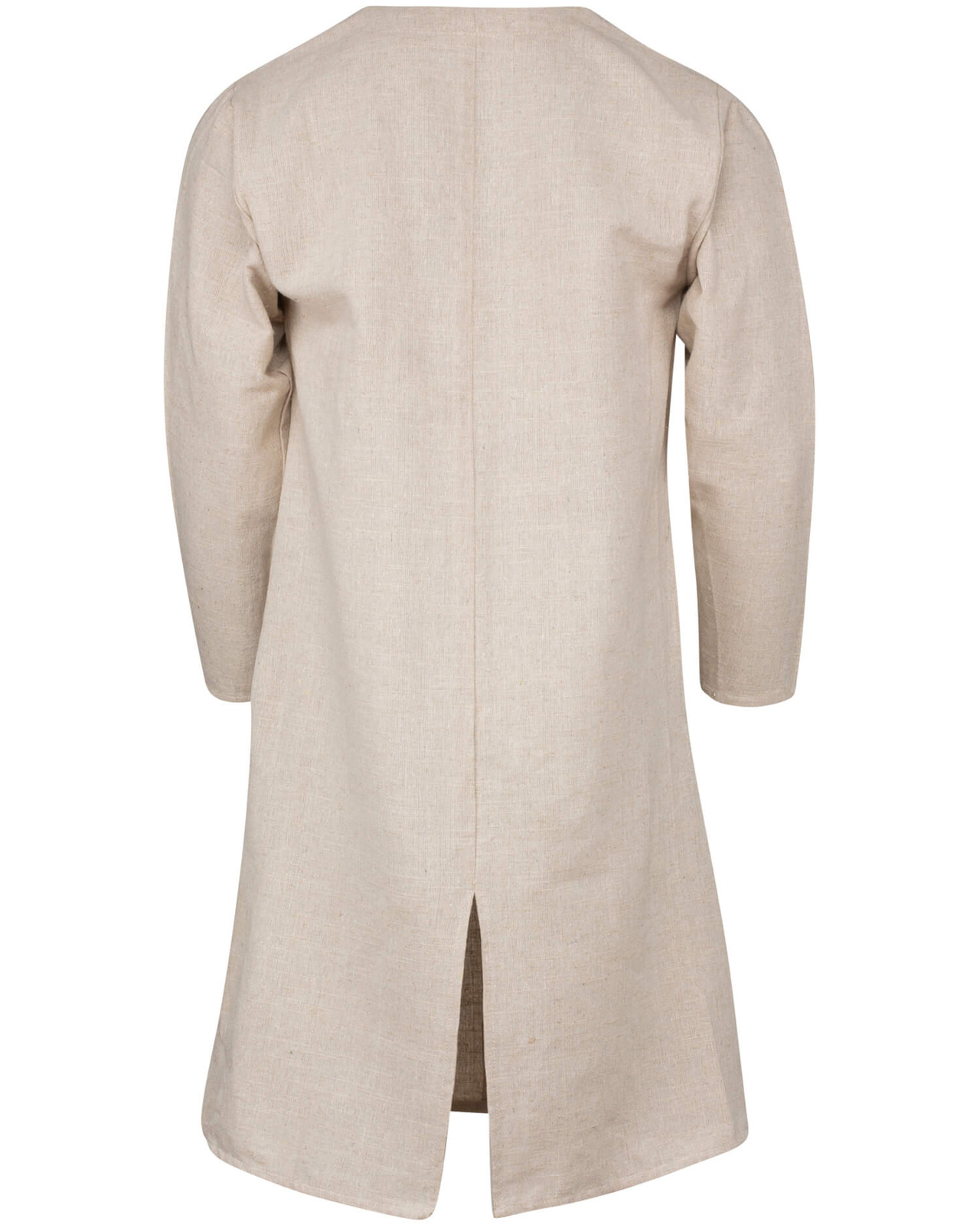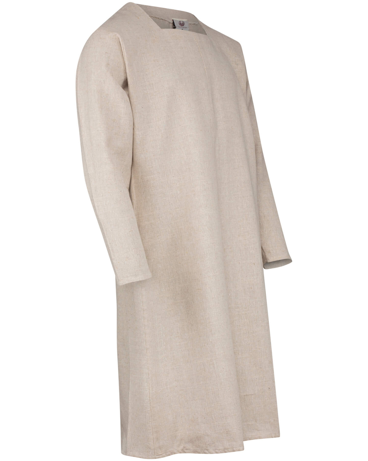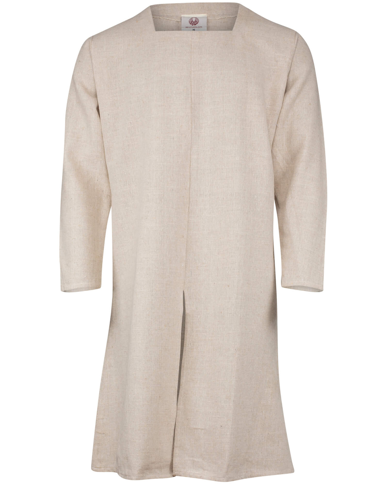 Uszyta z mocnej tkaniny lnianej (50% len, 50% bawełna) o splocie płóciennym, tunika jest nie tylko wytrzymała, ale też wygodna w noszeniu. Naturalny materiał zapewnia odpowiednią cyrkulację powietrza, co sprawia, że nadaje się zarówno na chłodniejsze dni w połączeniu z podtuniką, jak i na cieplejsze wydarzenia w plenerze.