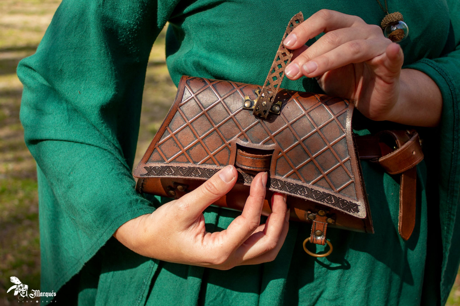 Ta wyjątkowa torba skórzana przenosi wprost do świata średniowiecznej fantazji, łącząc solidne rzemiosło z bogatymi zdobieniami inspirowanymi dawnymi czasami. Wykonana ręcznie z wysokogatunkowej, około 3 mm grubości skóry bydlęcej, z elastycznymi bokami z koziej skóry, zapewnia trwałość, a jednocześnie wygodę otwierania i zamykania.