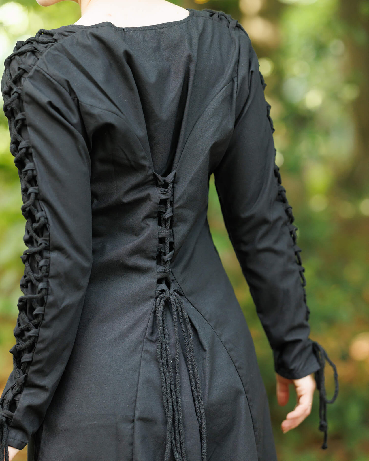 Dzięki wiązaniu z tyłu sukni możesz łatwo dopasować ją do swojej figury, uzyskując idealne przyleganie bez utraty wygody. Długie rękawy z zewnętrznym sznurowaniem nie tylko pozwalają na regulację szerokości, ale stanowią również subtelny, ozdobny akcent — szczególnie efektowny, gdy suknia noszona jest pod krótkim płaszczem lub suknią z krótkim rękawem.