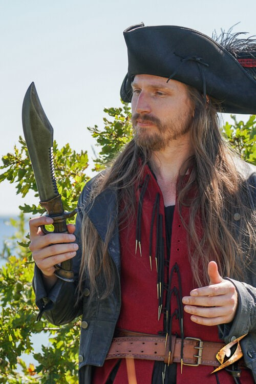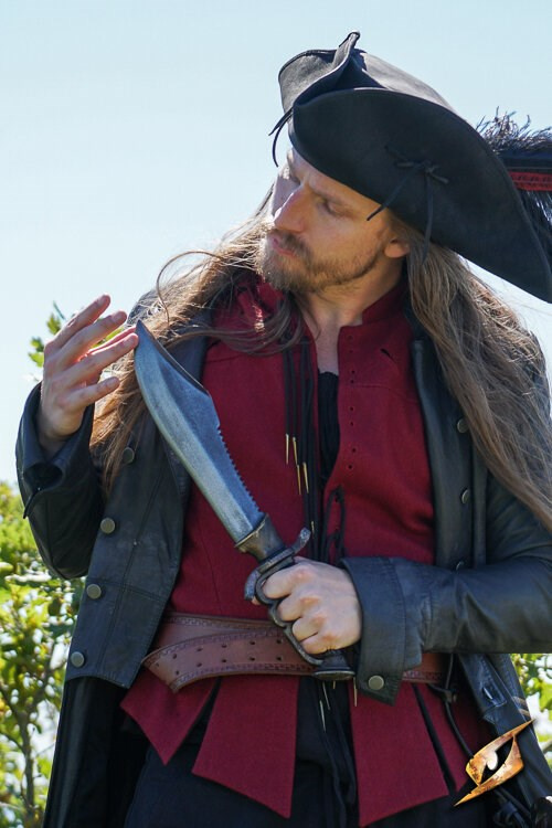 Trench Bowie mierzy 46 cm i doskonale łączy kompaktowość z solidnym wyglądem. Rękojeść stylizowana na postarzone drewno, wzmocniona „mosiężnym” kastetem, zapewnia pewny i wygodny chwyt, a ozdobne detale dodają wiarygodności. Ząbkowany grzbiet ostrza i wyraziste, masywne proporcje sprawiają, że broń prezentuje się naprawdę groźnie – nawet wtedy, gdy spoczywa przy pasie.