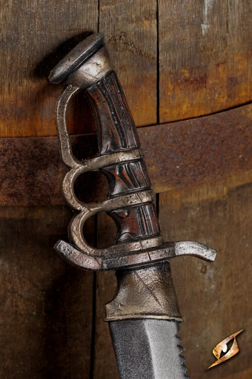 - Realistyczne detale: postarzana rękojeść, „mosiężny” kastet, ząbkowany grzbiet ostrza.
