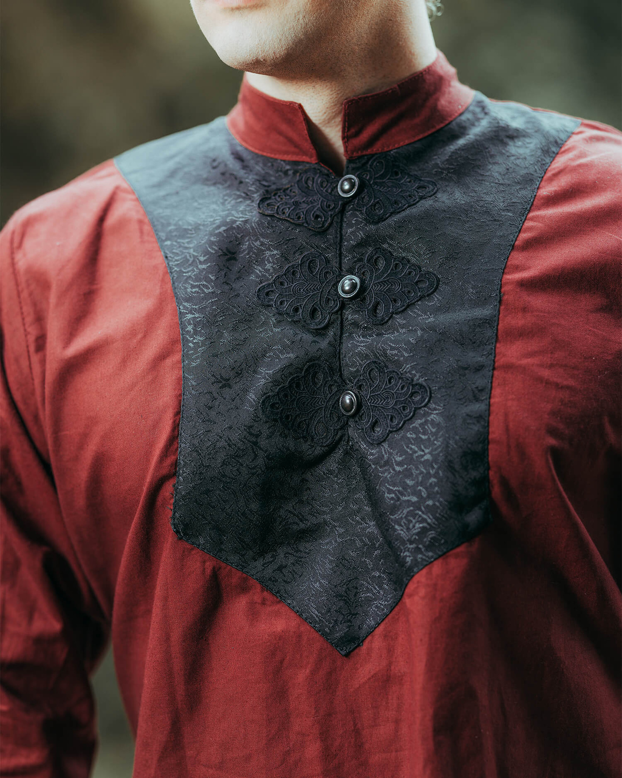 - Koszula Viscardi z lekkiej bawełny, ozdobiona tkaniną żakardową i metalowymi zapięciami. Stylowa i wygodna – idealna dla postaci o wyższym statusie lub eleganckich stylizacji.