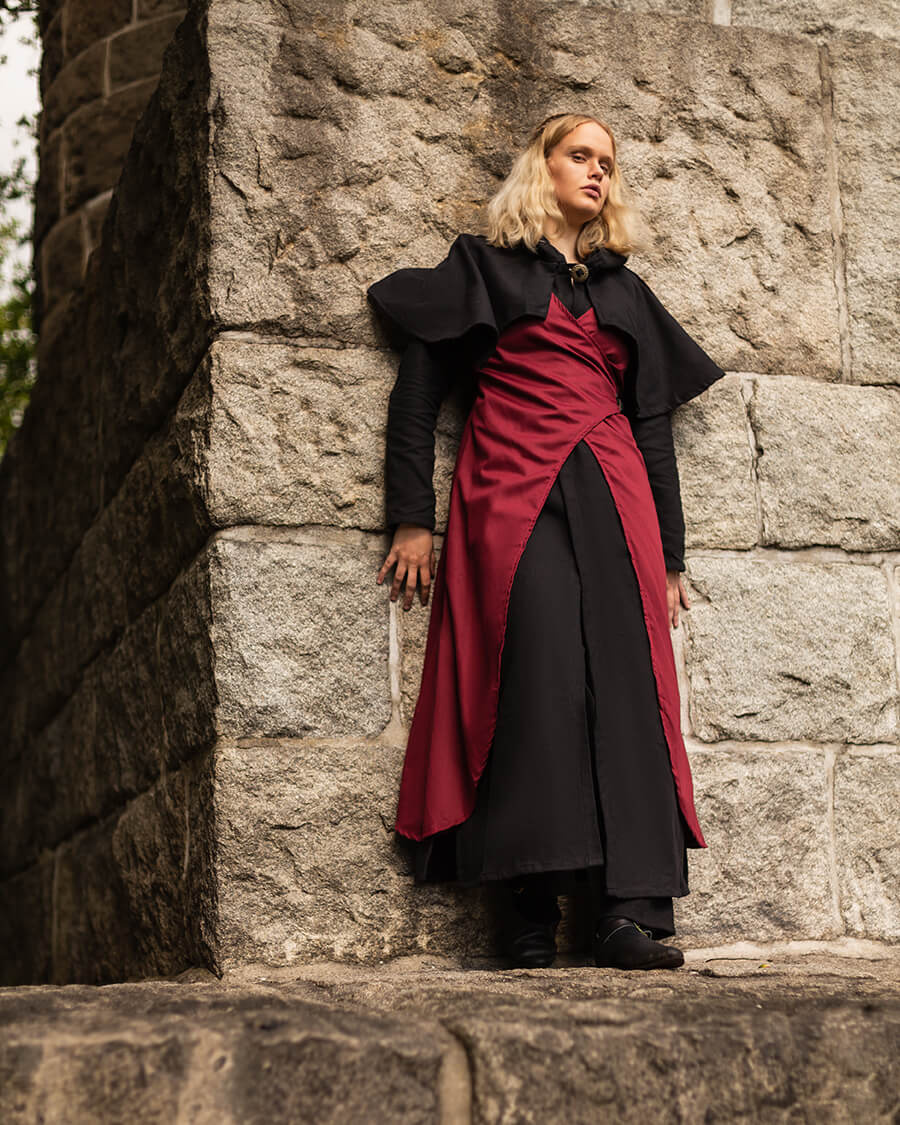 Vysera Overdress to wyjątkowy element garderoby, który dodaje głębi każdej stylizacji historycznej lub fantasy. Dzięki rozcięciom z przodu i z tyłu zapewnia pełną swobodę ruchów, a boczne zapięcie na sprzączkę pozwala na wygodne dopasowanie do sylwetki.