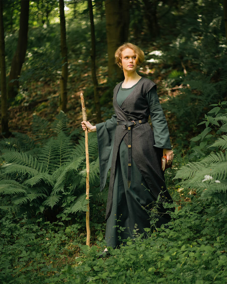 Suknię można nosić na różne sposoby – z lekką bawełnianą suknią spodnią w cieplejsze dni lub z grubszą, wełnianą, gdy temperatura spada. To uniwersalny element garderoby, który świetnie sprawdzi się w roli szaty czarodziejki, damy dworu czy elfiej łowczyni.